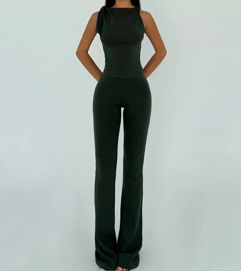 Koyu yeşil, kolsuz ve V yakalı bu tulum, midi boy ve standart kesimdir. Düz sentetik kumaştan yapılmış olup, minimalist ve çağdaş tarzıyla ofis için uygundur.
