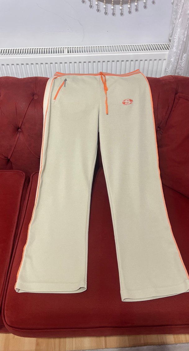 Kadınlara özel, fermuarlı cepli, normal boy ve fitted kesim eşofman altı. Bej tonlarında, turuncu detaylı, spor ve sokak stiline uygun. ♀️