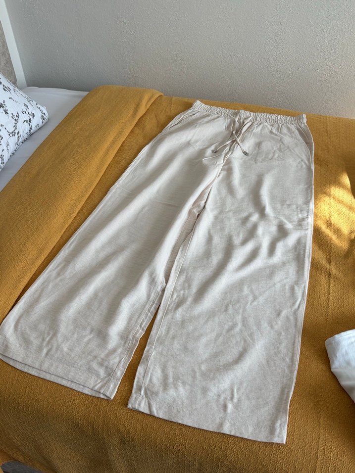 Kadın bej keten pantolon, rahat kesim ve midi boyda, minimalist ve normcore tarzıyla günlük kullanıma uygundur.