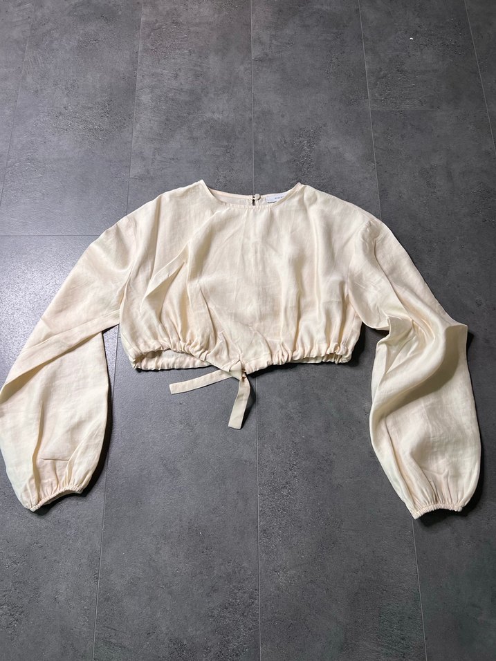 Ürün yeni ve etiketlidir Pamuktur Oversizedır S Beden En:40cm Uzunluk: 35 cm Kadınlar için krem keten kumaştan, uzun kollu, yuvarlak yakalı ve bol kesim kısa crop bluz. Minimalist ve zahmetsiz şıklık sunar.
