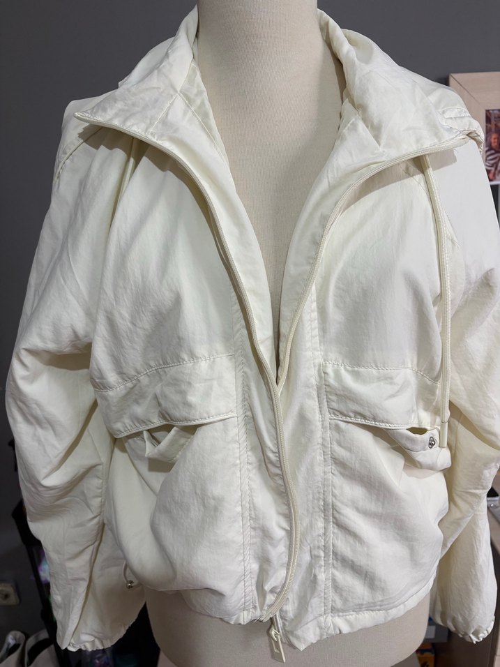 Bu krem keten ceket, yüksek yakalı ve fermuarlı ön yapısıyla minimalist bir sokak stili sunar. Bol kesim, uzun kollu ve normal midi boydadır.