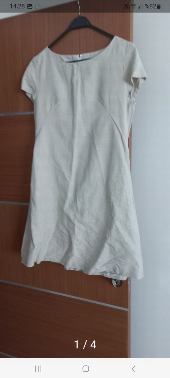 Keten kumaştan, kolsuz,kayık yakalı, salaş kesim midi boy krem elbise günlük sokak stiline uygundur.