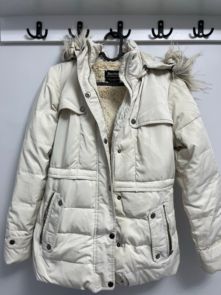 Fitted kesim krem kışlık mont, kürklü detaylar ve kesik yaka ile. Yumuşak sentetik kumaştan, rahat ve günlük kullanıma uygun. Fermuarın iç kısmında küçük bir lekesi mevcut içerde kalıyor gözükmüyor.