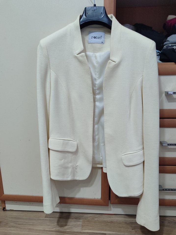 Krem pamuklu blazer ceket, kesik yaka ve düğmesiz ön detaylara sahiptir. uzun kollu ve klasik kesimdir. İş ve günlük kullanıma uygundur. ön sağ traafında hafif sökülme mevcut