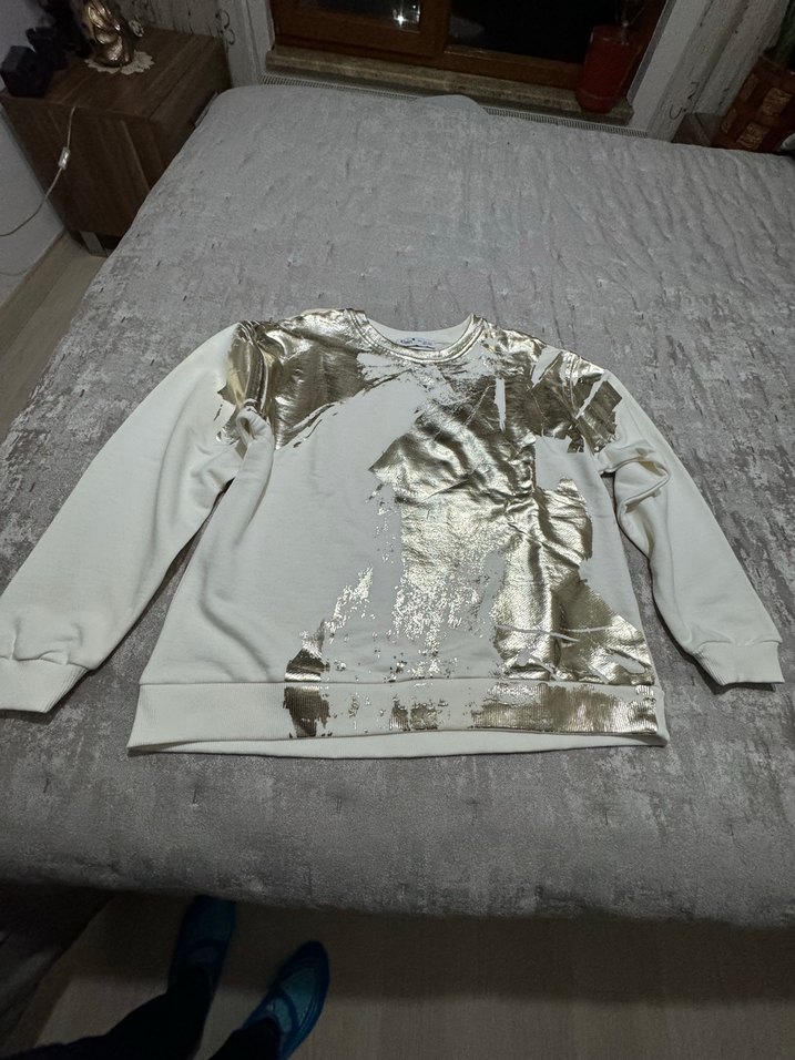 Uzun kollu, yuvarlak yakalı ve bol kesim kadın sweatshirtü. Krem renkte parlak altın baskılı desenlere sahip, yumuşak ve sıcak kumaştan üretilmiştir. Normal boyda, günlük kullanıma uygundur. S beden ama oversize ✨