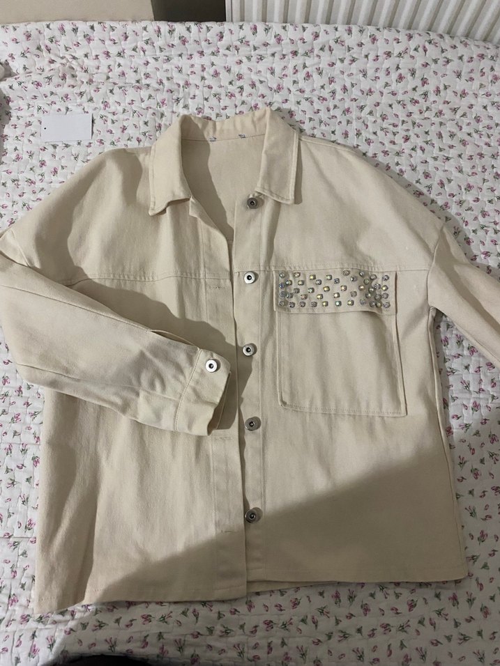 Kadınlar için düğmeli, uzun kollu, pamuk kumaştan yapılmış krem rengi gömlek. Notched lapel yaka ve küçük zımbalarla süslenmiş göğüs cebine sahiptir. Rahat kesim ve midi boyda, günlük sokak stili için uygundur.