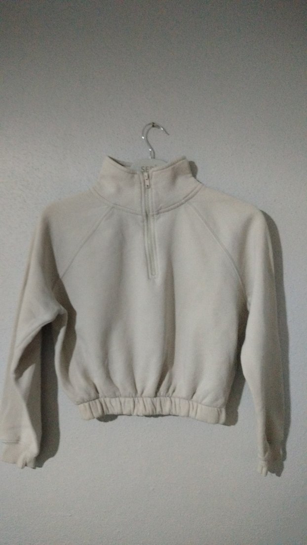 Kadınlar için yüksek yakalı, kısa ve yarım kesim sweatshirt. Uzun kollu ve fermuarlı, yumuşak ve sıcak krem kumaştan, günlük sokak stili için uygun.