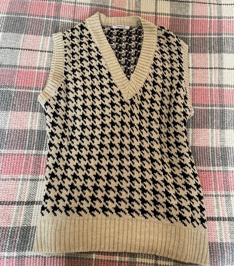 Kadınlar için V yaka, kolsuz, bol kesim örgü süveter.Krem tonlarında, sokak stiline uygun kazayağı desenlidir.