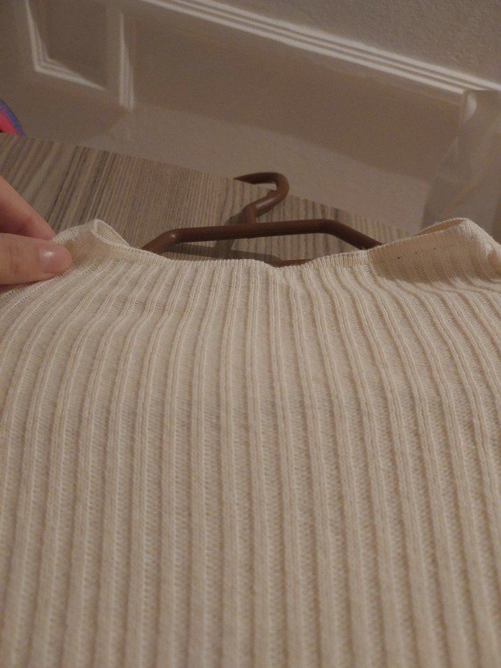 Krem renkli, uzun kollu ve boğazli kadın elbise. Triko sade ve rahat kullanıma uygun. Boyu omuzdan 125 cm
