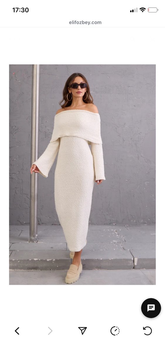 Beyaz triko kumaştan, tek renk, uzun kollu ve kayık yaka kadın uzun elbise. Rahat kesimi ve sade şıklığıyla günlük kullanıma uygundur. Krem rengi