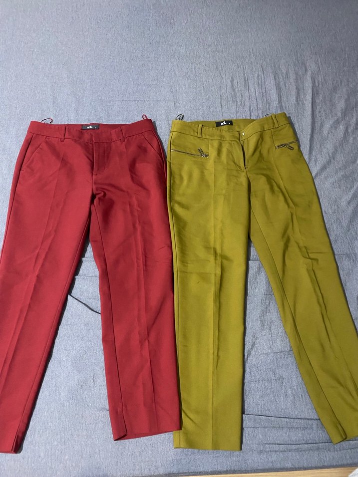Renkli kırmızı ve yeşil tonlarda, fermuarlı cepleri ve midi boyu ile günlük rahat kullanıma uygun kadın normal kesim kumaş pantolon. Sorunsuz adil Işık ürünleri
