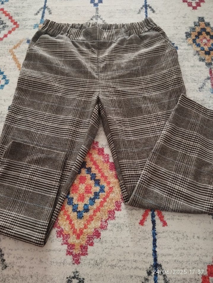 kadın kumaş pantolon, regular fit ve yumuşak sentetik kumaştan. Gri ve kahverengi kareli beli lastikli