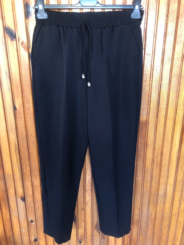 siyah renkli beli lastikli ve ipli iplerinin uçlarında metalleri vardır polyester kumaş yanlardan cepli 42 bedene uygun yüksek bel kadın kumaş pantolon bel 32 cm boy 95 cm bel ve ağ arası 30 cm paça genişliği 17 cm