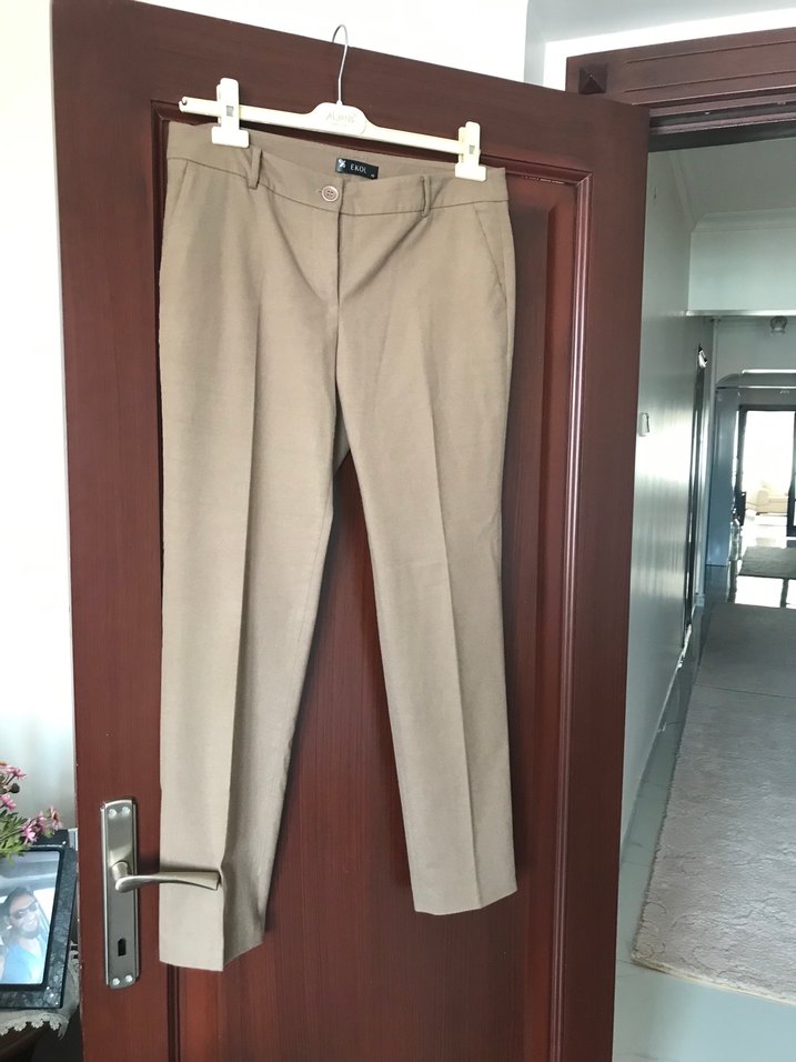 kadın kumaş pantolon, normal boyda ve kemerli tasarıma sahiptir. Düz ve iş ortamına uygun şık bir modeldir. Boy 102 cm paça 17 cm 56 cm bel yüksekliği 30 cm bir kaç kez kullanıldı %63 polyester renk vizon kışlık