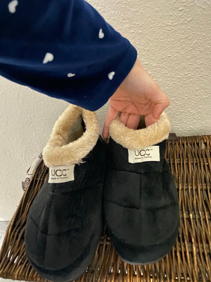Koyu gri renkli, kürk detaylı erkek çocuk terliği. Sıcak ve rahat kullanımıyla günlük rahat stil için uygundur.