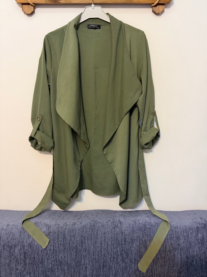 TOP SHOP marka haki renk S beden beli kuşaklı yakaları dökümlü kusuru yok  Haki renk Kadın haki renk uzun, salaş kesim, drapeli ön ve kesik yaka detaylı trençkot. Ayarlanabilir uzun kollu, yumuşak sentetik kumaş, günlük sokak stili için uygundur. Haki renk haki renk S beden kusuru yok veli kuşaklı yakaları dökümlü