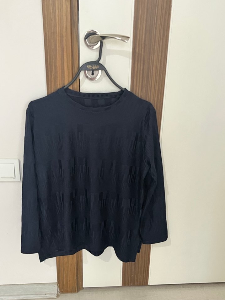 Siyah keten kumaştan, uzun kollu, yuvarlak yakalı, piliseli detaylara sahip, bol kesim ve midi boyda minimalist tarzda kadın kazak. Günlük kullanım için uygundur.