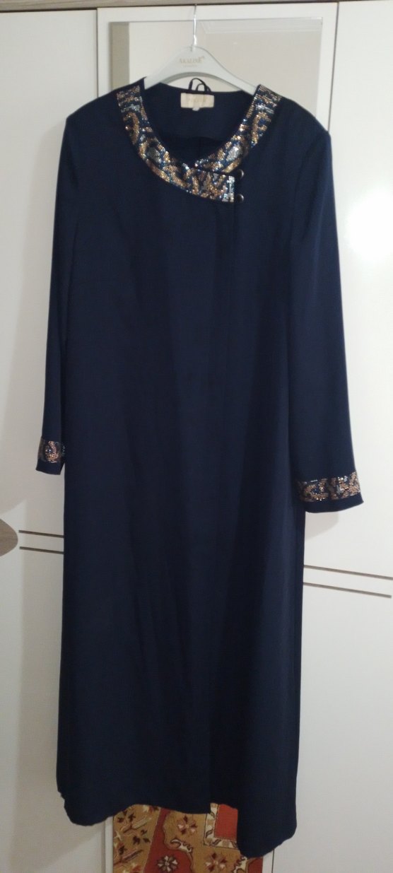 Lacivert, uzun kollu, yakasında taş işlemeli detaylar bulunan, ipeksi kumaştan yapılmış klasik abiye ferace. Günlük ve özel günlerinizde kulllanilabilir rahat ve şık bir feracedir.