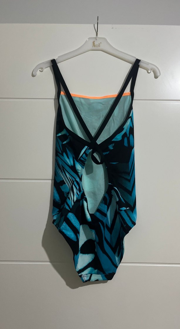 Bu dar kesim kadın mayosu, lacivert tonlarında bağcıklı askılar ve batik desen içerir. Spor için uygun, çağdaş tarzda drapeli tasarıma sahiptir. ♀️