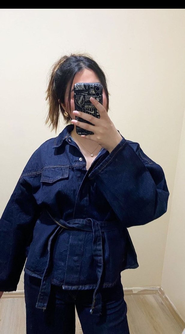 KOT TAKIM - Lacivert renkli, bağcıklı ve salaş kesim denim ceket. Uzun kollu, yakası düğmeli ve batik desenlidir. Günlük rahat kullanıma uygundur.