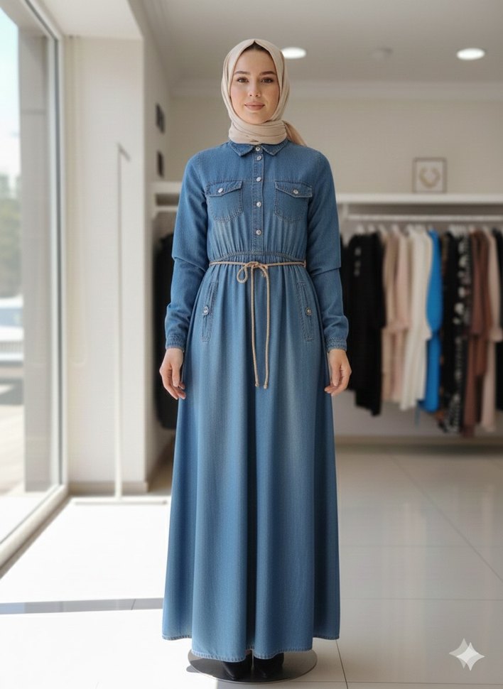 Kadın Lacivert Bağcıklı Uzun Kot Elbise