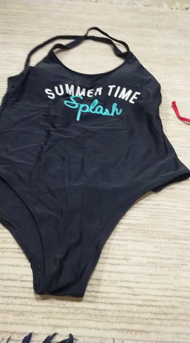 Kadınlar için ince askılı, baskılı ve elastik yapılı lacivert mayo. "SUMMER TIME Splash" yazılı, normal midi boyda ve vücuda oturan kesime sahip. ️