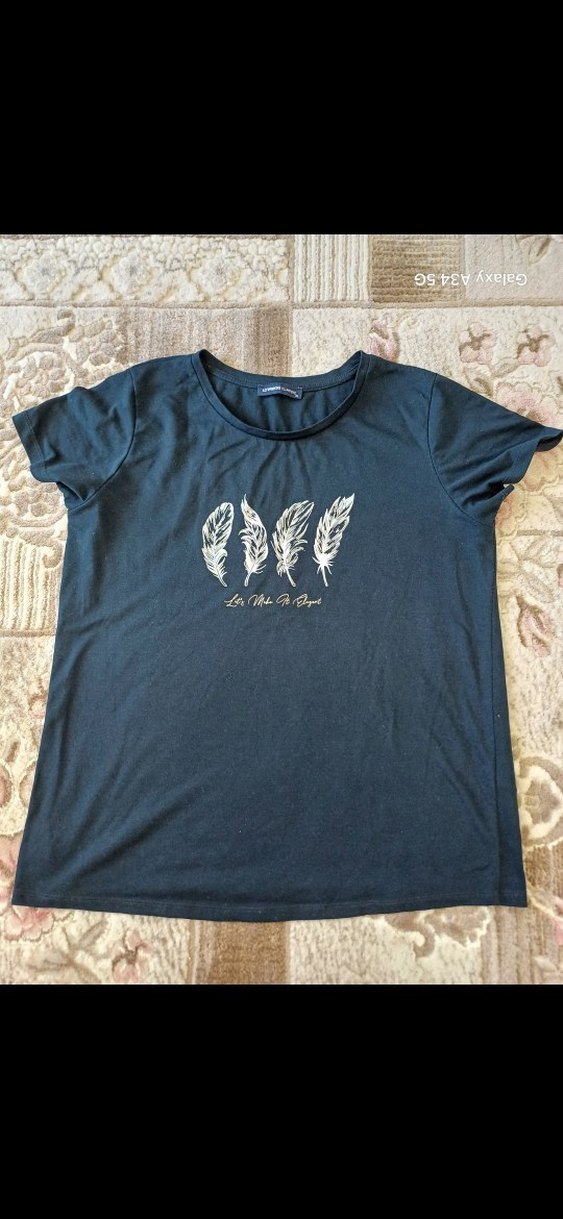 Kadınlar için kısa kollu, yuvarlak yaka ve pamuklu kumaştan yapılmış. Önünde baskılı tüy deseni bulunan, bol kesim rahat tişört.