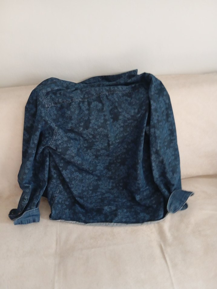 Lacivert denim kumaştan, uzun kollu, yakalı ve düğmeli gömlek. Batik desenli, salaş ve midi boyda, günlük sokak stiline uygun bir parça. XL uyumlu.