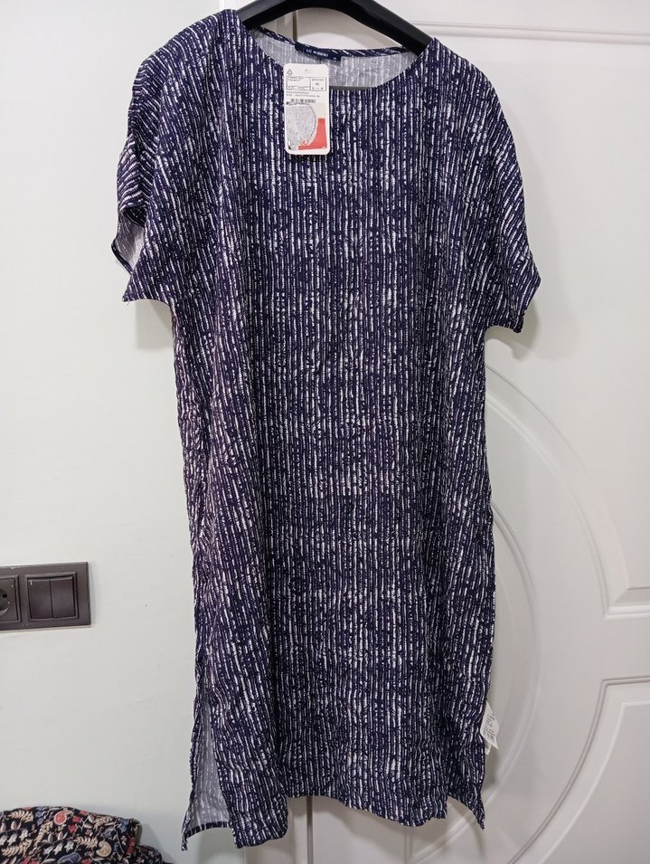 Kadınlar için kısa kollu, salaş kesim ve tekne yakalı uzun viskon elbise. Lacivert batik desenli ve 50 bedenede olur , günlük rahat kullanım için uygundur.