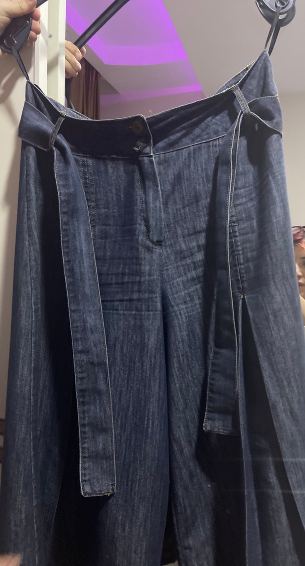 Lacivert kot kumaştan, bel detaylı, midi boy, bol kesim etekli pantolon. Günlük kullanıma uygun, desensiz ve normcore tarzda. Etekli pantolon