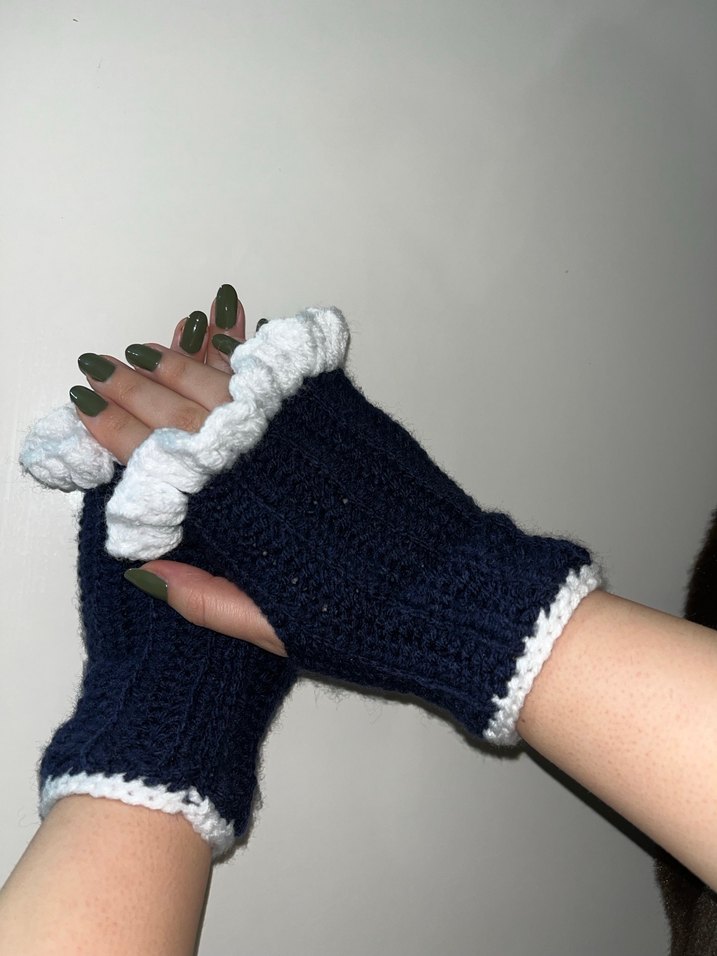 Koyu mavi örgü, beyaz fırfırlı kadın eldivenleri, rahat ve modaya uygun gotik stil sunar. İstenilen renkte örülür