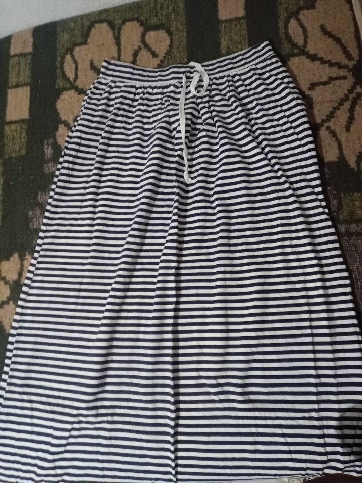 Kadınlar için lacivert beyaz çizgili, bol kesim uzun etek. Yumuşak sentetik kumaştan üretilmiş, günlük rahat sokak stili için uygundur. küçük bı lekesi var ama çok belli olmuyo