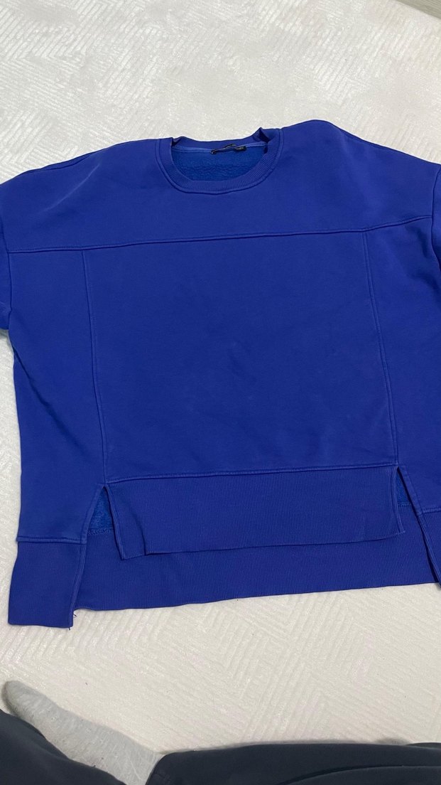 Kadınlar için bisiklet yaka ve uzun kollu, bol kesim sweatshirt. Yumuşak ve sıcak kumaştan, koyu mavi renkte, gündelik kullanıma uygun sade tasarım.