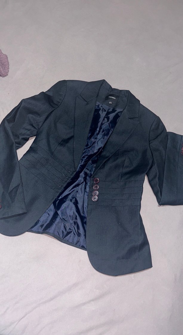 Kadınlar için düğmeli, uzun kollu blazer ceket. Normal boyda,memuriyete başlayınca aldım sonrasın üniformaya geçtik 1 belki 2 kez kullanmışımdır tertemiz ce acayip şık belden oturtmalı çok zarif bi duruşu var malı da çok kaliteli