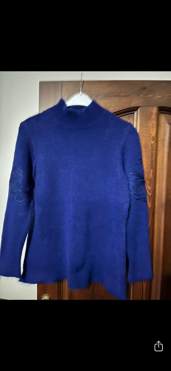 Kadınlar için lacivert boğazlı, uzun kollu, örme dokulu ve yumuşak sıcak kumaştan yapılmış bol kesim kazak. Normal midi boyda ve desensiz, günlük kullanıma uygundur. XL beden. Angora kazak. Temiz sağlam ve defosuz sadece bir kez kullandım.Kazee marka