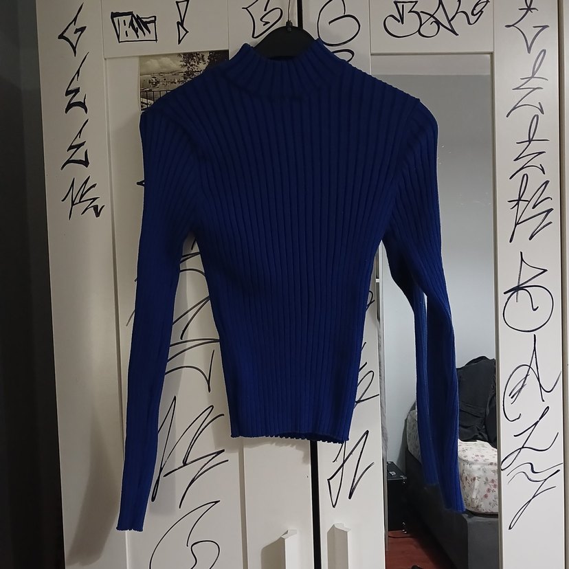 Kadınlar için boğazlı, uzun kollu, ince örme lacivert triko kazak. Normal midi boyda, desen içermeyen, trend sokak tarzına uygun.