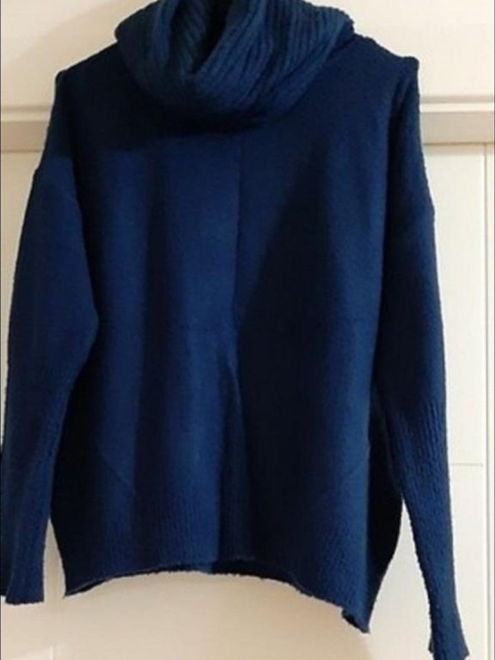 Lacivert renkte, boğazlı ve uzun kollu, örgü yapıda, bol kesim yumuşak kumaştan günlük kullanıma uygun kazak.