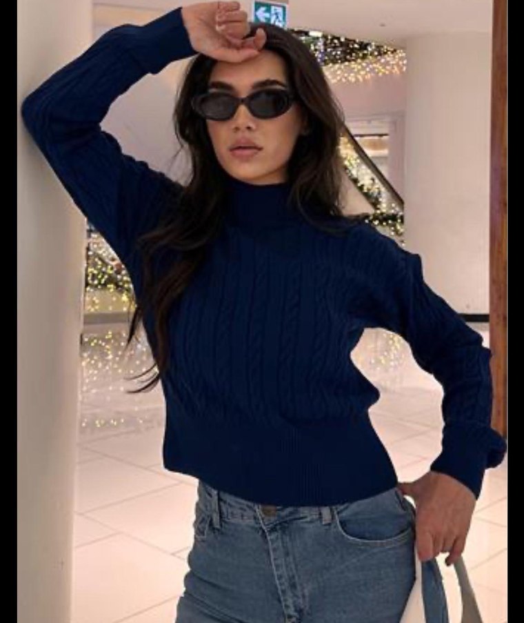 Lacivert, boğazlı ve uzun kollu, vücuda oturan kadın triko kazak. Örgü dokusu ile kısa boyda,