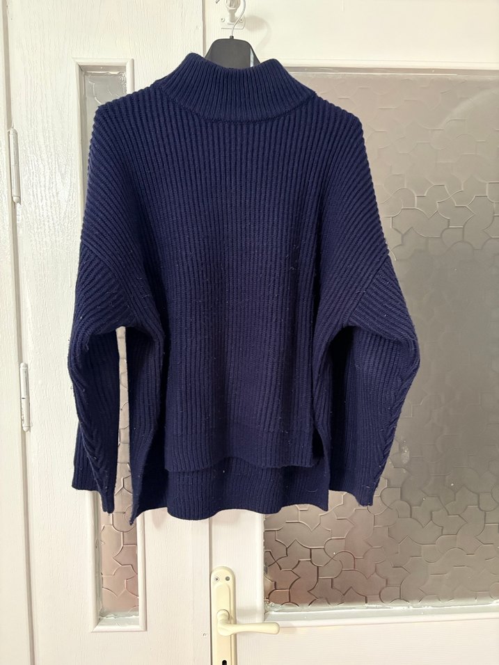 Kadınlar için boğazlı, uzun kollu, örme dokulu triko kazak. Rahat kesim ve midi boy ile günlük kullanıma uygun, sade lacivert renkli.