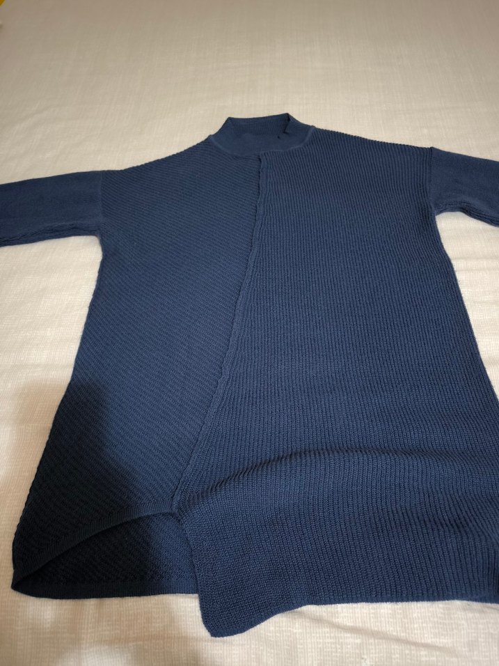 Bu kadın lacivert triko kazak, boğazlı ve uzun kollu olup, örme kumaştan yapılmıştır. Normal midi boyda, rahat ve normcore tarzda, günlük kullanıma uygundur.