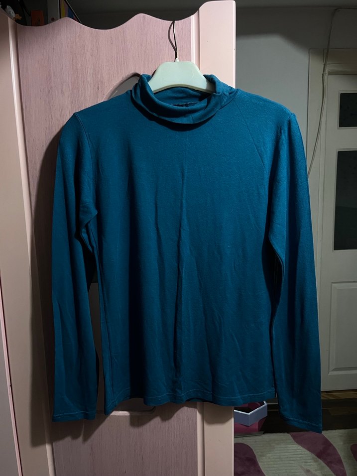 Kadın lacivert boğazlı, uzun kollu, yumuşak ve sıcak kumaştan yapılmış, normal boyda, desen içermeyen basic kazak. Günlük kullanıma uygundur.