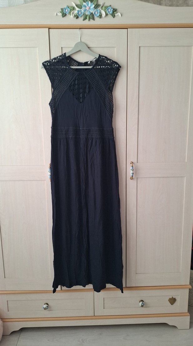 Bu kolsuz lacivert uzun elbise, bol kesim ve drapeli tasarım ile V yakaya sahiptir. Sentetik kumaştan yapılmış, günlük kullanım için bohem tarzındadır.