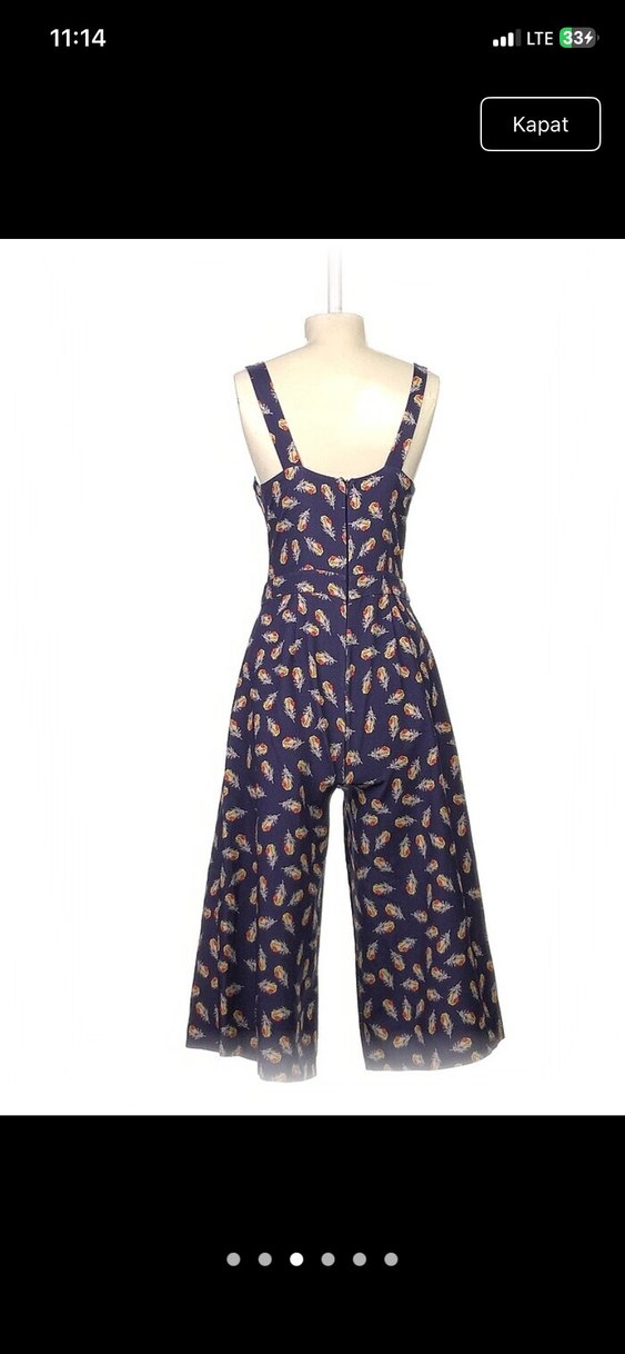 Kadınlar için uzun, bol kesim, askılı ve straplez yakalı, pileli detaylı lacivert tulum. Sentetik kumaştan, vintage bohem tarzında, günlük kullanıma uygun.