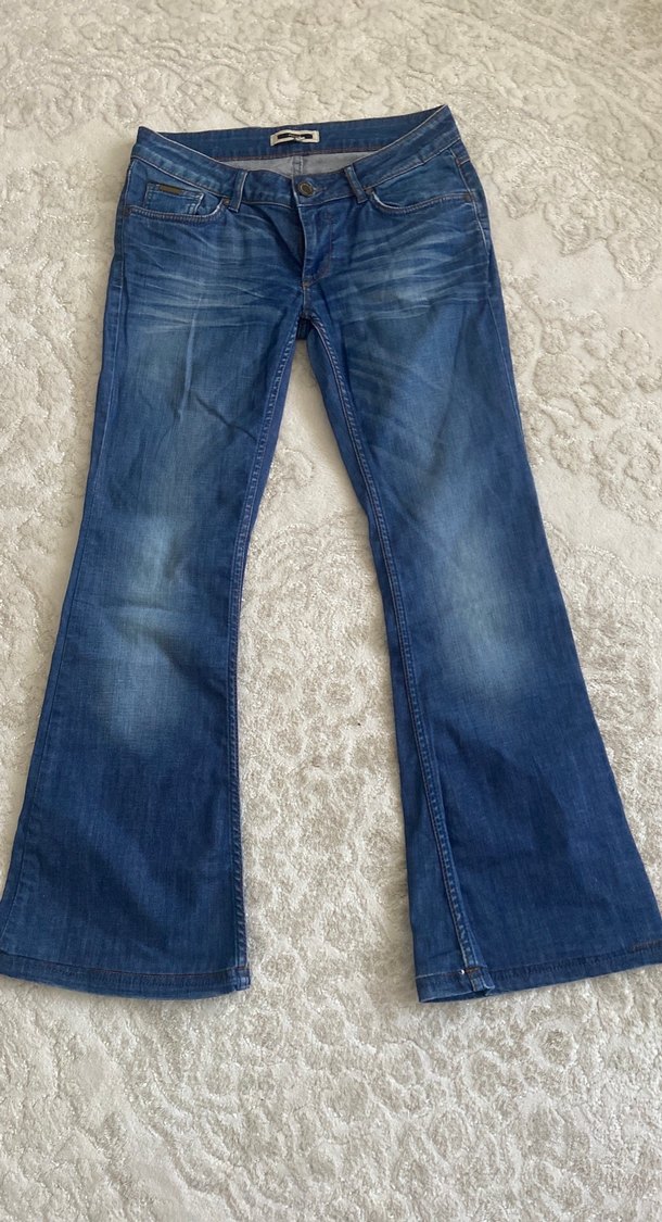 Lacivert renkte, bol kesim ve normal boyda, yumuşak denim kumaştan yapılmış kadın jean pantolon. Dantel detaylarıyla günlük kullanıma uygundur.