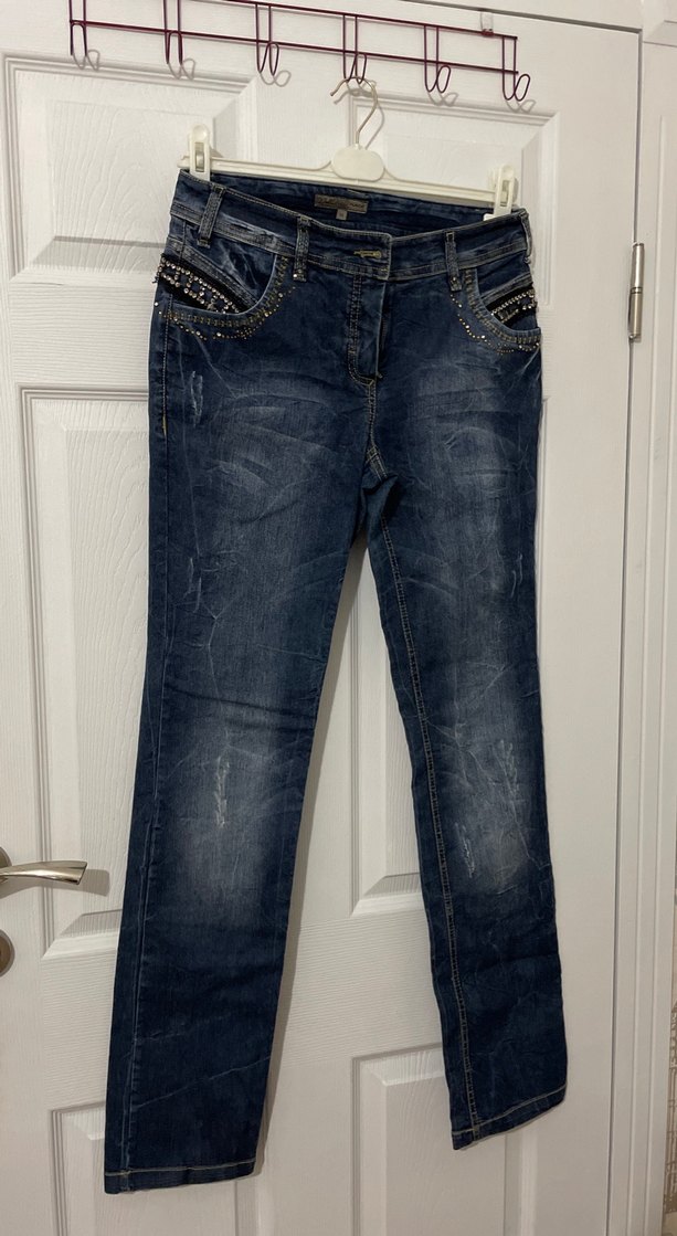 Lacivert bol kesim denim pantolon, parlak batik desenli ve ceplerinde tokalı detaylar, günlük rahat kullanım için uygun.