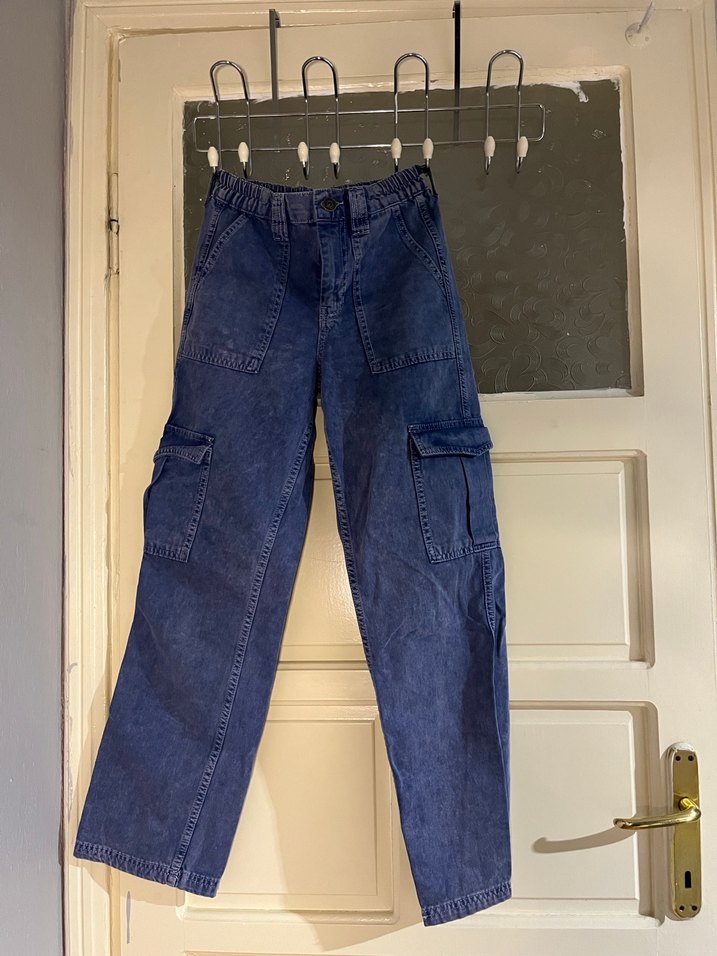 Lacivert kargo kot pantolon, bol kesim ve belinin arkası lastikli ve gri batik desenli, rahat sokak stili için uygun.