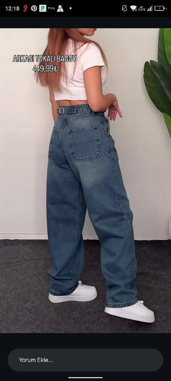 Kadınlar için lacivert kot pantolon, bol kesim ve kemerli bel ile günlük sokak stiline uygun. Midi boy ve desen yok, rahat kullanım sunar.