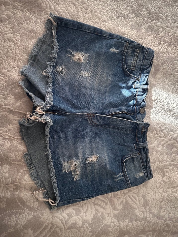 Lacivert kot şort, bol kesim ve mini boyda, yıpranmış detaylara sahip. Tokalı ve rahat sokak stili, günlük kullanım için uygun.