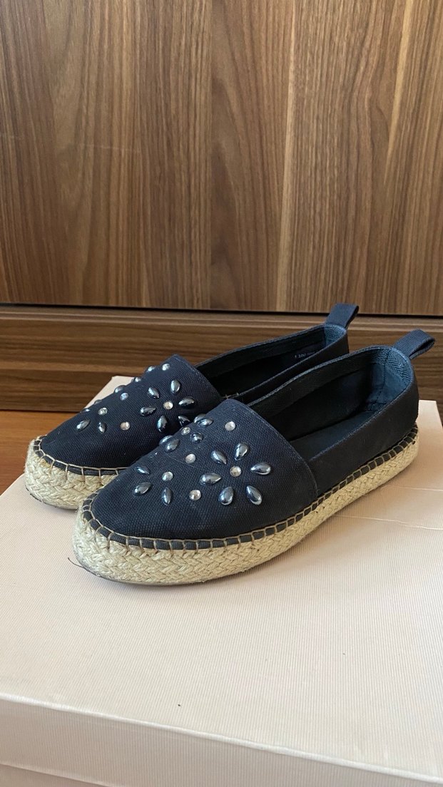 Lacivert kot kumaştan, boncuk işlemeli çiçek desenli, dolgu topuklu espadril. Günlük kullanıma uygun, sade ve şık tarz.