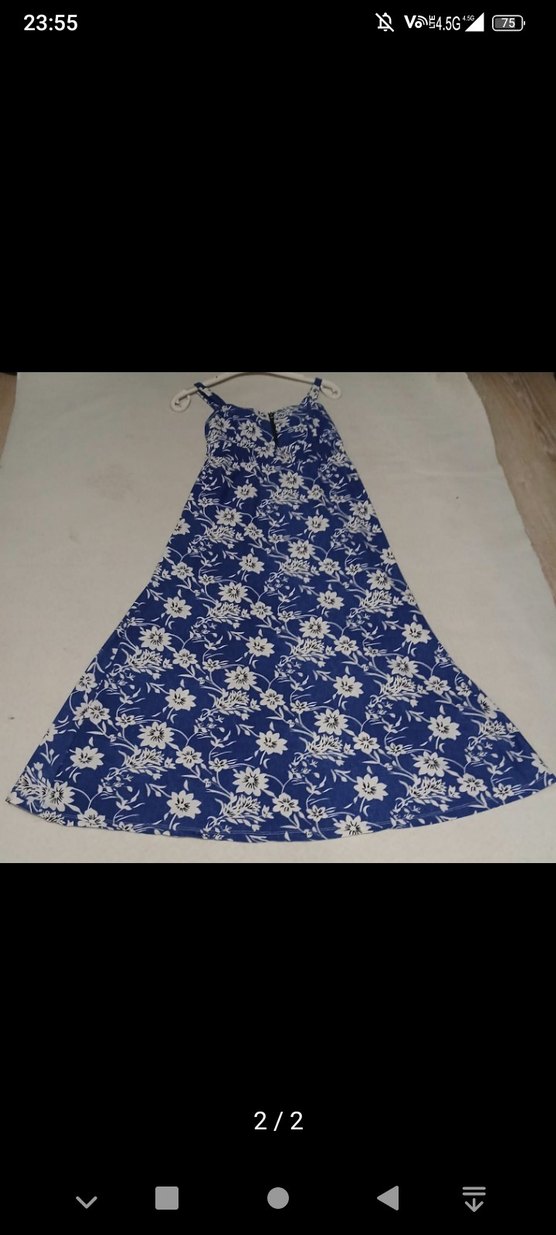 Lacivert uzun elbise, straplez yakalı ve dökümlü tarzda, bol kesimdir. Çiçek desenli ve askılı kolludur, bohem tarzda günlük kullanıma uygundur.